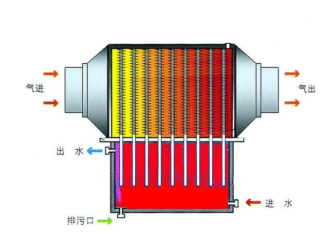 熱管余熱回收裝置體積小,只是普通熱交換器的1/3。其工作原理如下圖所示:左邊為煙氣通道,右邊為清潔空氣(水或其它介質(zhì))通道,中間有隔板分開互不干擾。高溫煙氣由左邊通道排放,排放時高溫煙氣沖刷熱管,當煙氣溫度>30℃時,熱管被激活便自動將熱量傳導至右邊,這時熱管左邊吸熱,高溫煙氣流經(jīng)熱管后溫度下降,熱量被熱管吸收并傳導至右邊。常溫清潔空氣(水或其它介質(zhì))在鼓風機作用下,沿右邊通道反方向流動沖刷熱管,這時熱管右邊放熱,將清潔空氣(水或其它介質(zhì))加熱,空氣流經(jīng)熱管后溫度升高。